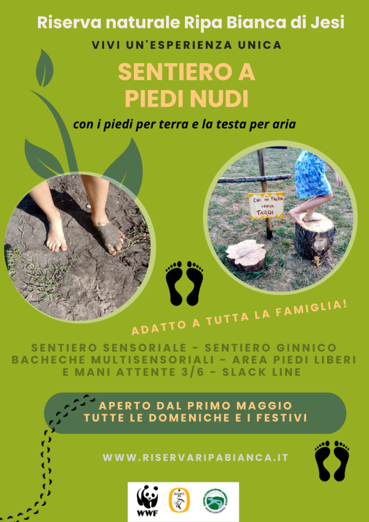 - VIVERE UN’ESPERIENZA ORIGINALE LUNGO IL SENTIERO A PIEDI NUDI 300 metri di materiali naturali tutti da toccare e scoprire con i piedi e un’area ginnica dove mettere alla prova equilibrio, coraggio e fiducia! (residenti a Jesi ingresso sentiero euro 4)